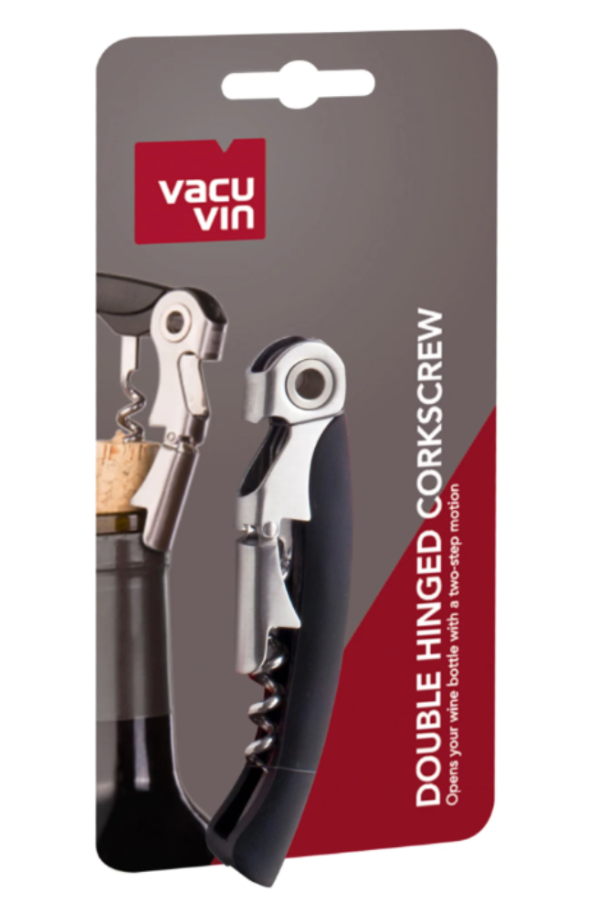 The Double Hinged Corkscrew is a sleek, 3-in-1 tool that makes opening wine bottles convenient with a two-step motion.